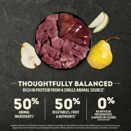 Ingredientes limitados não significam menos carne. ACANA Singles Free-run Duck é composto por 50%* de ingredientes de pato de alta qualidade em proporções WholePrey, complementados com deliciosas peras Bartlett inteiras, fornecendo ao seu cão a proteína e os nutrientes necessários para se manter feliz, saudável e forte.