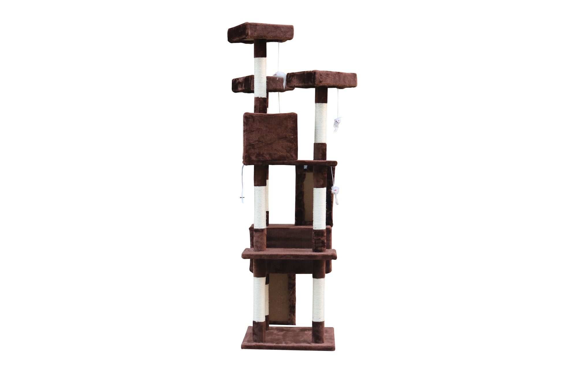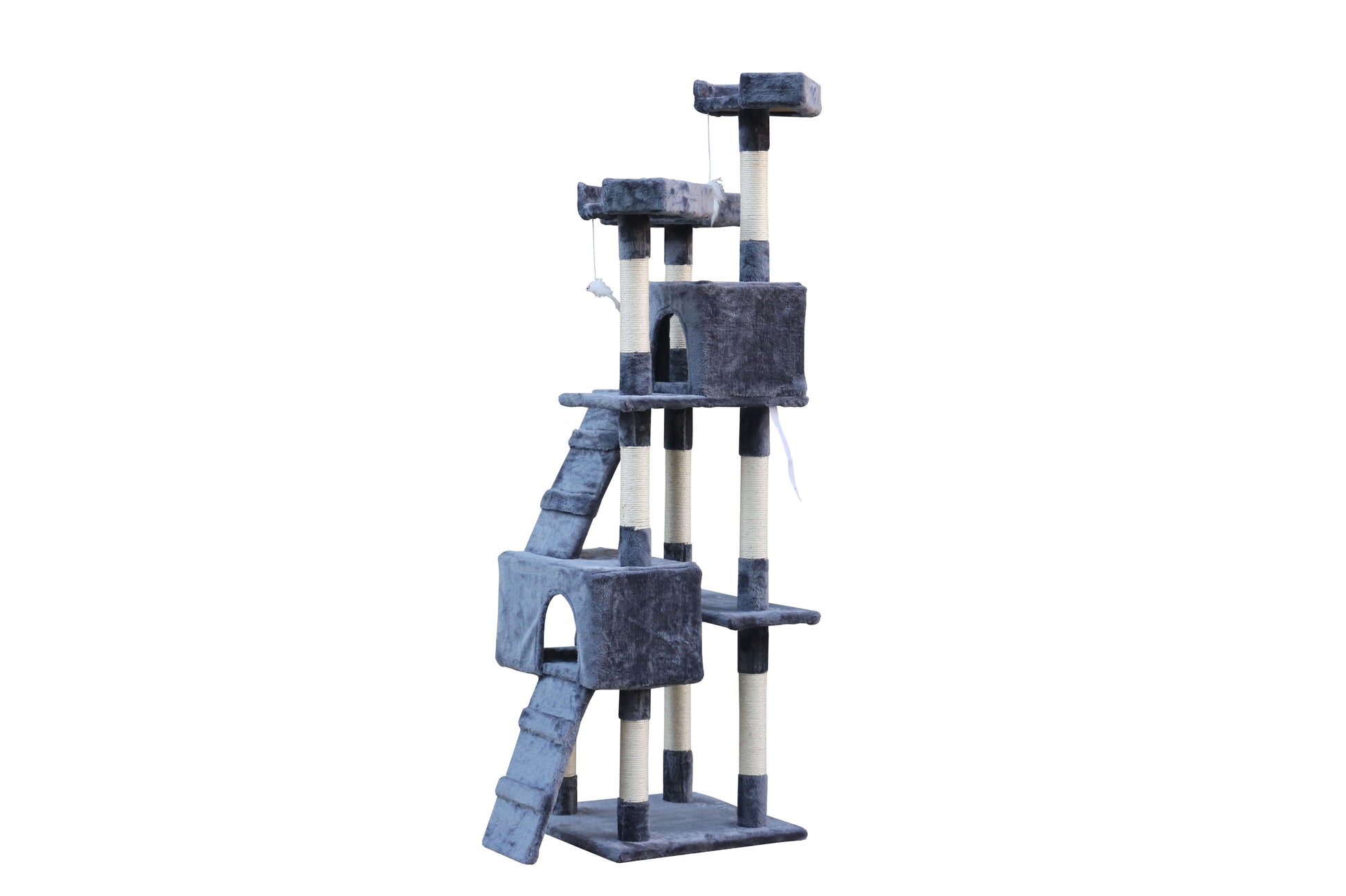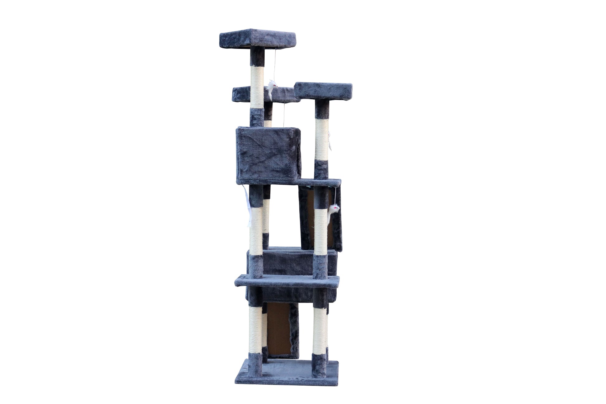 A base e a rede são cobertas com pelúcia macia e de pêlo longo, mantendo o seu gato confortável e aquecido, quer fique aconchegado dentro das casas ou a descansar nas plataformas. Um pompom suspenso aumenta o apelo deste arranhador magnífico!