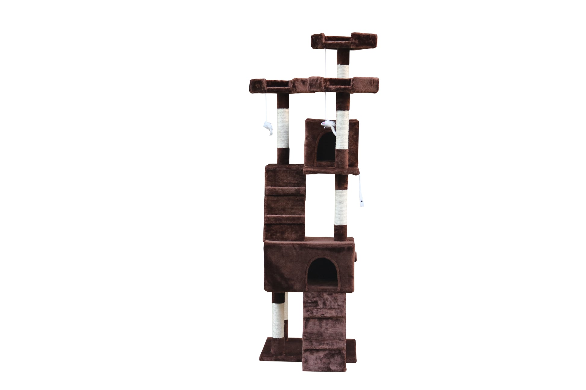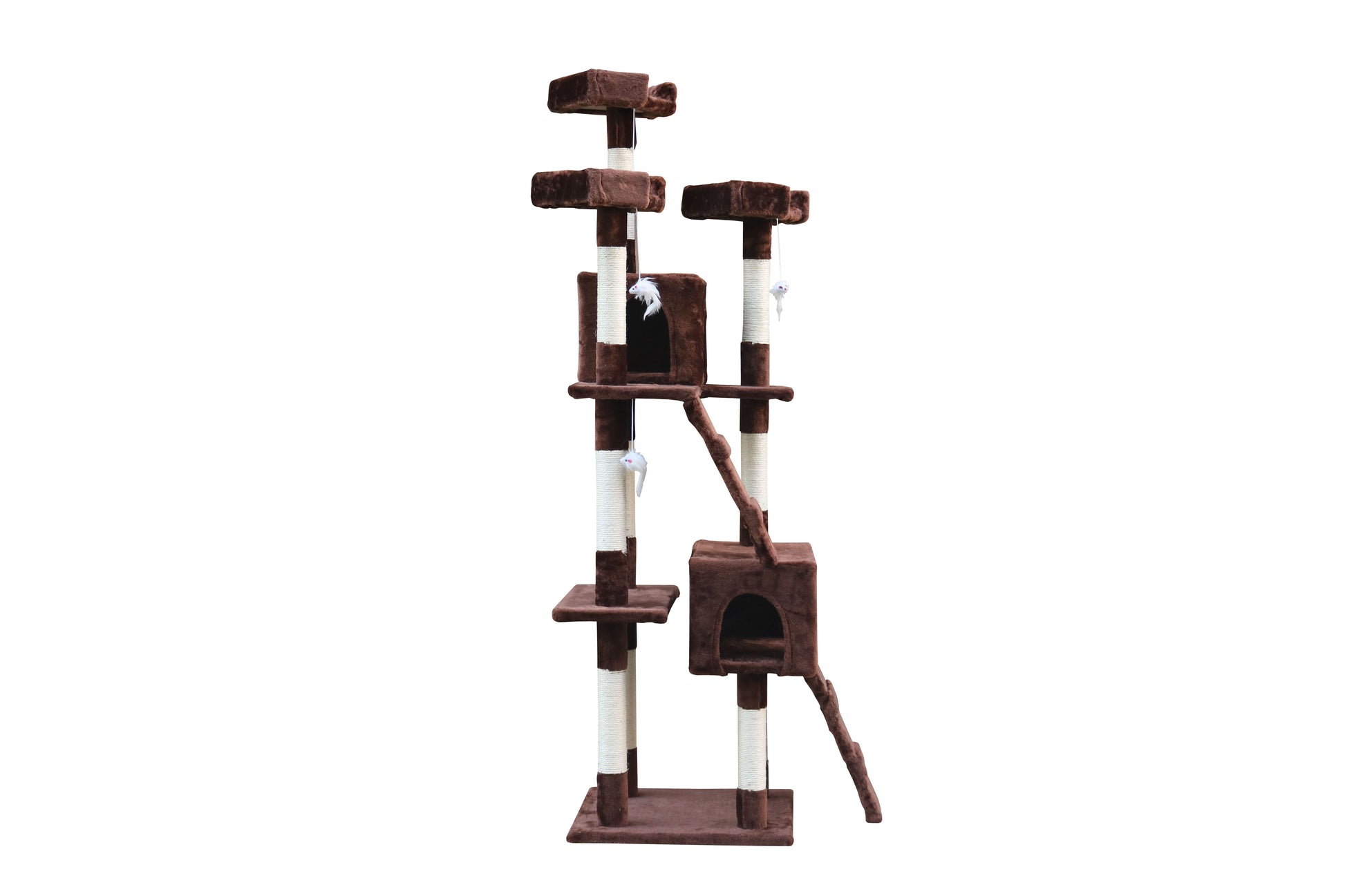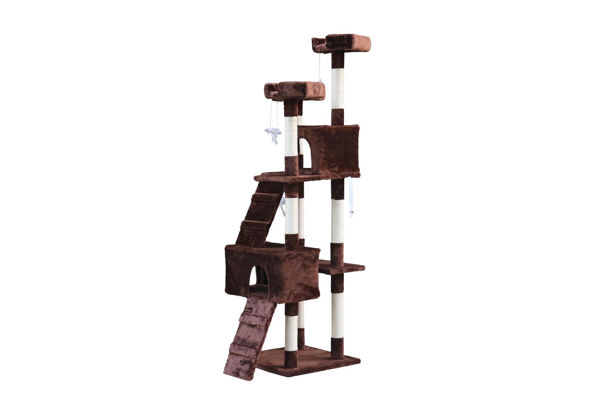 A base e a rede são cobertas com pelúcia macia e de pêlo longo, mantendo o seu gato confortável e aquecido, quer fique aconchegado dentro das casas ou a descansar nas plataformas. Um pompom suspenso aumenta o apelo deste arranhador magnífico!