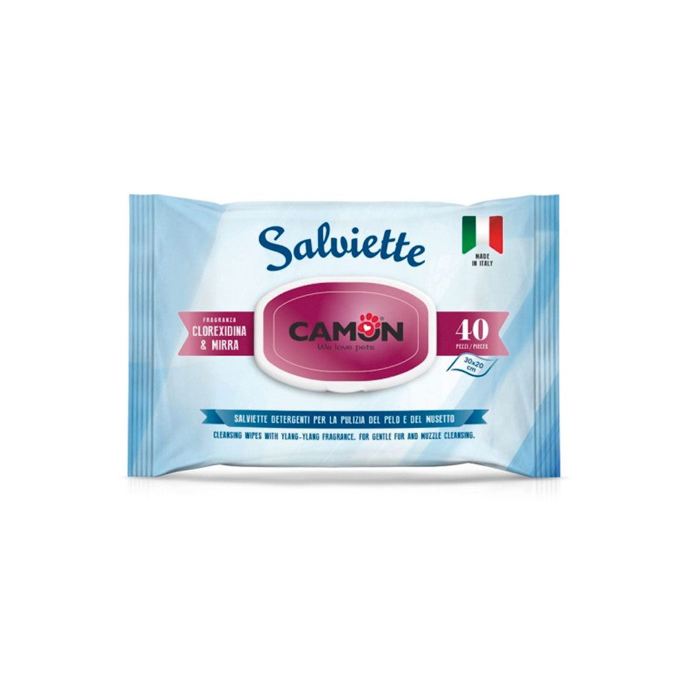 Toalhitas para limpeza do pêlo de cães e gatos. Com fragrância de clorexidina e mirra.