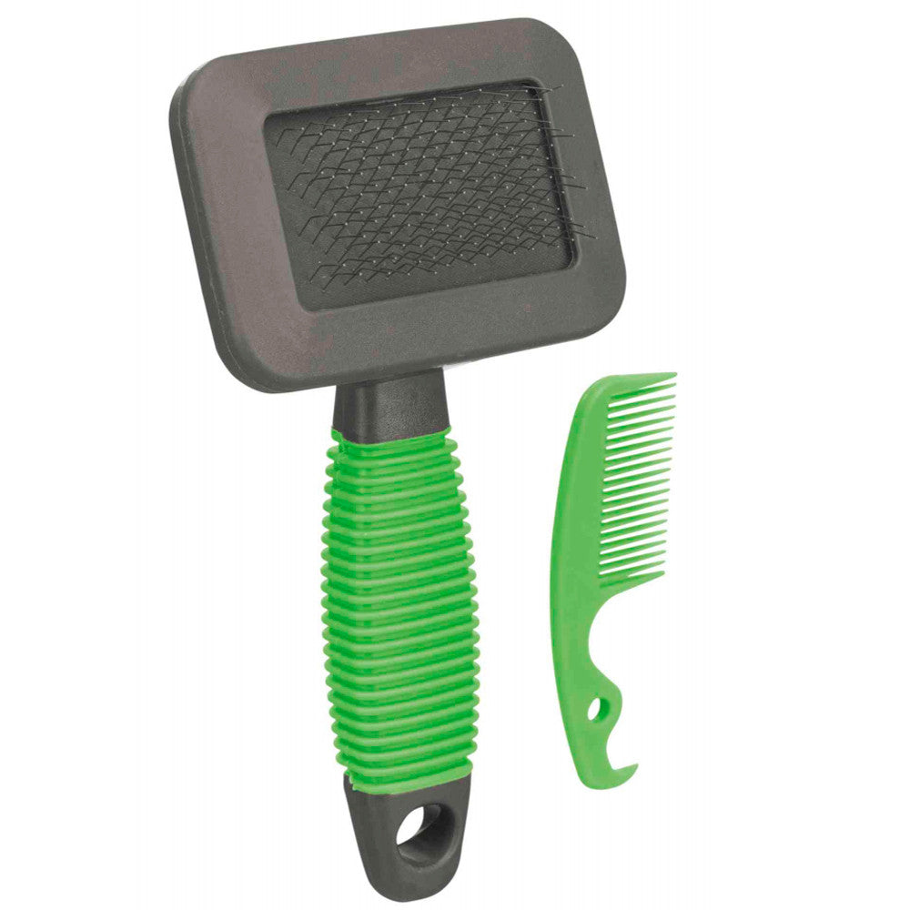 Escova macia Trixie com cerdas metálicas suaves e pente de limpeza. Ideal para roedores, com pega anti-deslizante e design confortável. Cores sortidas.