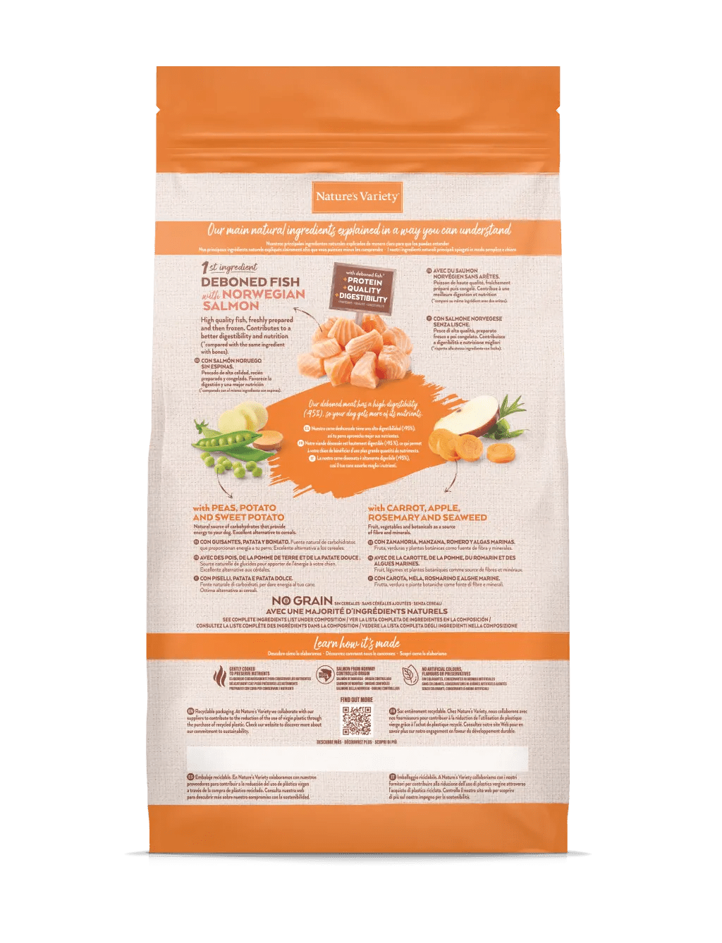 Salmão norueguês* (20%), proteína de atum desidratada (18%), ervilhas desidratadas* (15%), batata desidratada* (8%), proteína de batata, gordura de aves* (7%), batata-doce* (4%), proteínas animais hidrolisadas (aves, porco, peixe) (4%), amido de ervilha*, polpa de beterraba*, minerais, proteína de ervilha*, cenoura desidratada* (0,5% equivalente a 4% de cenoura fresca), maçã desidratada* (0,3% equivalente a 2% de maçã fresca), alga marinha desidratada (kelp)* (0,01%), alecrim desidratado* (0,01%). *Ingredientes naturais