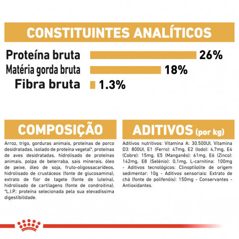 Arroz, trigo, gorduras animais, proteínas de porco desidratadas, isolado de proteína vegetal*, proteínas de aves desidratadas, hidrolisado de proteínas animais, polpa de beterraba, sais minerais, óleo de peixe, óleo de soja, frutooligossacarídeos, hidrolisado de crustáceos (fonte de glucosamina), extrato de flor de tagete (fonte de luteína), hidrolisado de cartilagens (fonte de condroitina).