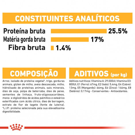Sabia que a irritação cutânea é o principal motivo das consultas veterinárias? A sensibilidade e o prurido provocam muita coceira, algo que pode levar o seu cão a magoar-se e, podendo haver mesmo, risco de provocar uma infeção. A fórmula do Royal Canin Dermacomfort Mini foi cuidadosamente preparada mediante uma gama de proteínas especificamente selecionadas Esta nutrição especificamente adaptada ajuda o seu cão a manter uma boa condição da pele. Além disso, também contribui para a vitalidade e saúde da pelagem do seu cão.