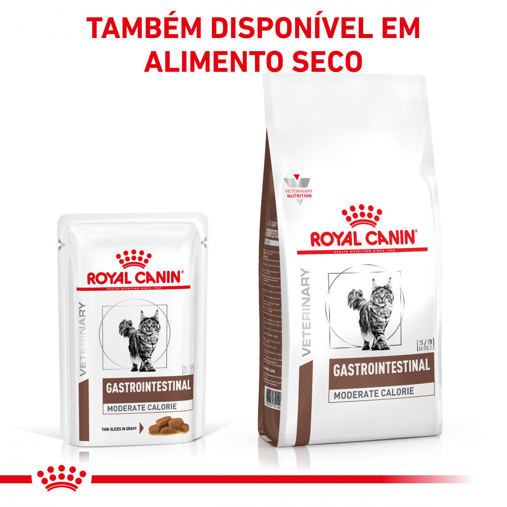 O Royal Canin Gastrointestinal Moderate Calorie é especificamente formulado para gatos com excesso de peso (ou gatos com tendência para comer em excesso) para ajudar a apoiar a saúde digestiva em casos de sensibilidade gastrointestinal.