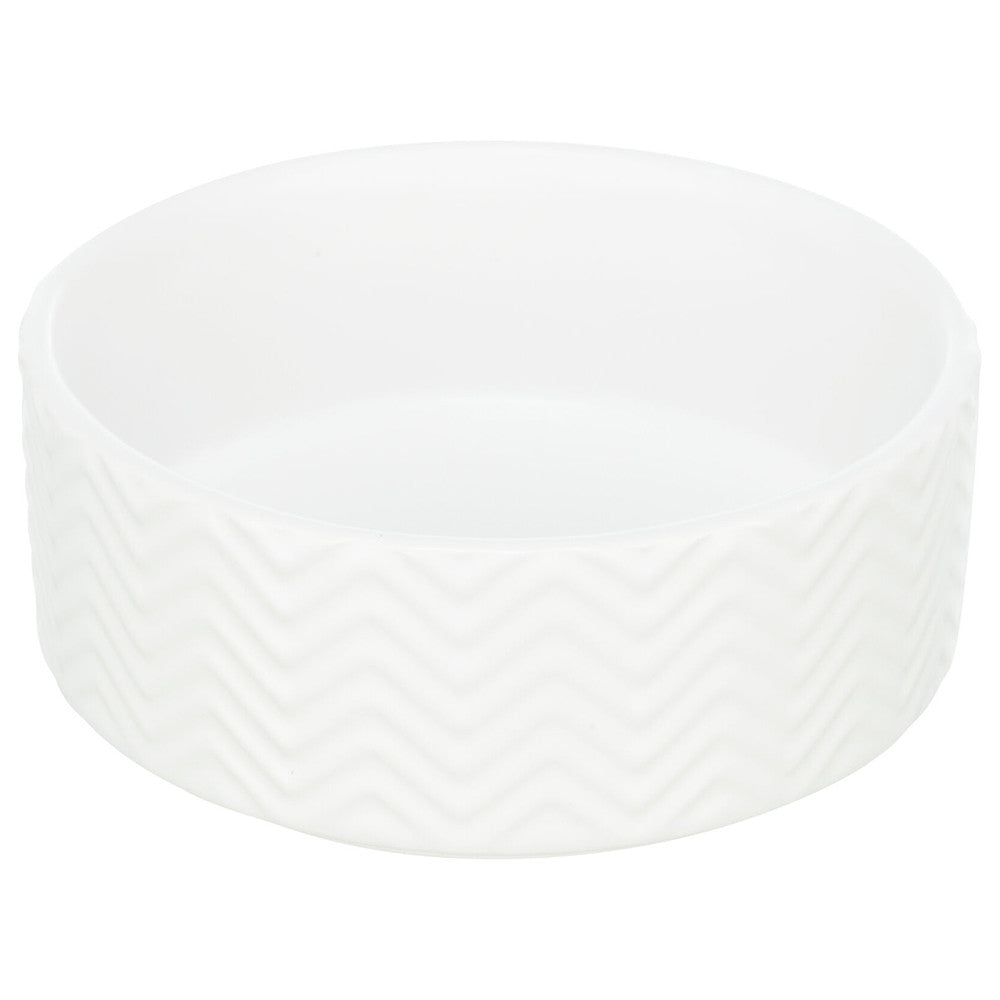Comedouro/bebedouro branco em cerâmica para cães ou gatos, ideal para ração seca, alimentos húmidos ou água.
