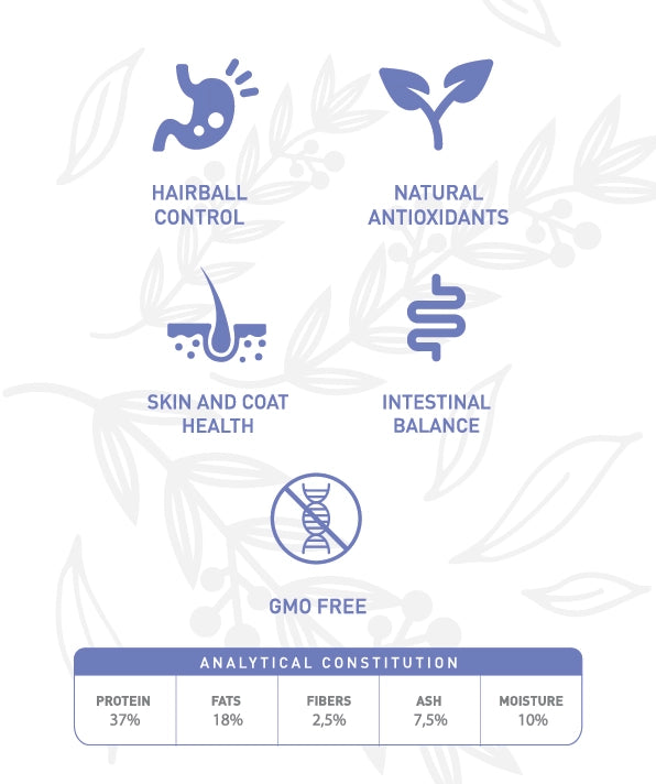 COMPOSIÇÃO ANALÍTICA | Proteína: 37%; Gordura: 18%; Fibra: 1,5%; Cinza: 6,5%; Humidade: 10%.
