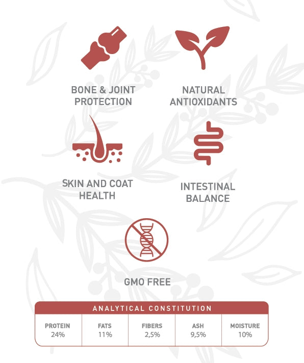 COMPOSIÇÃO ANALÍTICA | Proteína: 24%; Gordura: 11%; Fibra: 2,5%; Cinza: 9,5%; Humidade: 10%.
