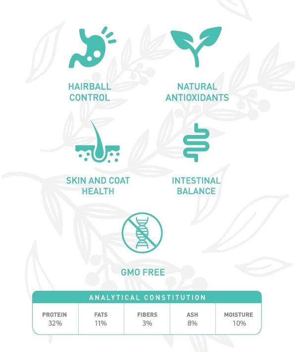 COMPOSIÇÃO ANALÍTICA | Proteína: 32%; Gordura: 11%; Fibra: 3%; Cinza: 8%; Humidade: 10%.
